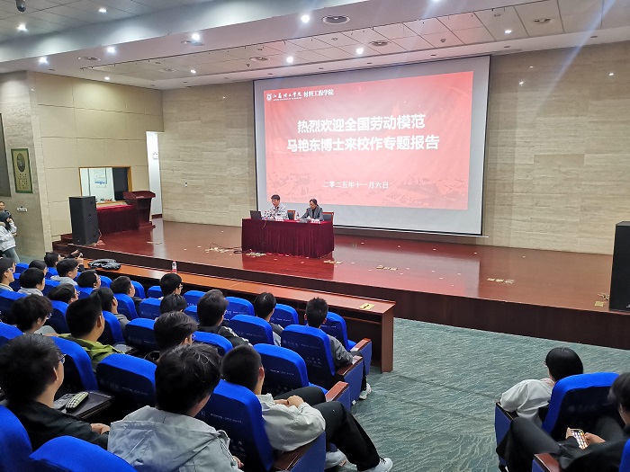 为进一步提升人才培养质效,推动劳模精神、劳动精神、工匠精神融入人才培养全过程,11月6日晚,我院在图书馆北报告厅举行“劳模工匠进校园”专题宣讲活动。活动特邀全国劳动模范、中国铸造大工匠、江苏恒立液压股份有限公司常州铸造分公司总经理马艳东,与我院师生面对面交流,分享成长历程与奋斗心得。院党委书记张纪霞、党委副书记兼副院长占成、材料成型及控制工程系葛茂忠教授、学工办主任徐洁、辅导员张新栋、2025级全体新生及部分入党积极分子代表参加了活动,活动由张纪霞主持。