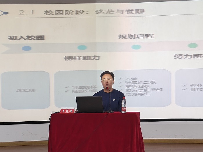 王爱伟以“从校园到星辰大海——我的成长突围之路”为题,结合个人成长经历,从“初心归来-我的校园与职场序章”“成长轨迹-从迷茫到坚定的突围之路”“干货锦囊-学业・时间・职业三重赋能”“感恩寄语-共赴未来之约”四个篇章回顾过往、启迪未来,强调了岗位所需的专业知识、能力素质和工作经验,从学业管理、时间管理、职业规划三个方面对同学们提出了提前布局未来的具体实施方案,叮嘱同学们要做一个懂得感恩、积极向上、有目标、敢行动、善复盘的追光者。在互动提问环节,王爱伟围绕专业技能提升、方向选择、考研与就业等多方面话题与同学们进行了深入交流,他说:“人生没有白走的路,每一步都算数,今天的我,离不开当年在母校踩过的坑、遇过的光,母校给我的不仅是知识,更是面对未知的勇气,十年前母校给我的,我愿尽绵薄之力带给大家。”