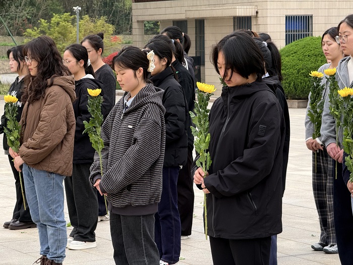 国歌唱毕,现场气氛转而凝重。在低沉的哀乐声中,全体师生脱帽肃立,向为民族独立、人民解放和国家富强而英勇献身的革命先烈默哀三分钟,表达深切的追思与缅怀。25金属2班杨宇航作为代表在纪念碑前宣读悼词,悼词回顾了先烈们为了理想信念抛头颅、洒热血的光辉历程,并号召新时代大学生要铭记历史,珍惜来之不易的幸福生活,继承先烈遗志,勇担时代重任。在庄重的氛围中,全体师生手持象征高洁的菊花,依次缓步绕行瞻仰烈士纪念碑,将手中的菊花轻轻摆放在纪念碑基座前,以此寄托对英魂的无限敬仰与哀思。